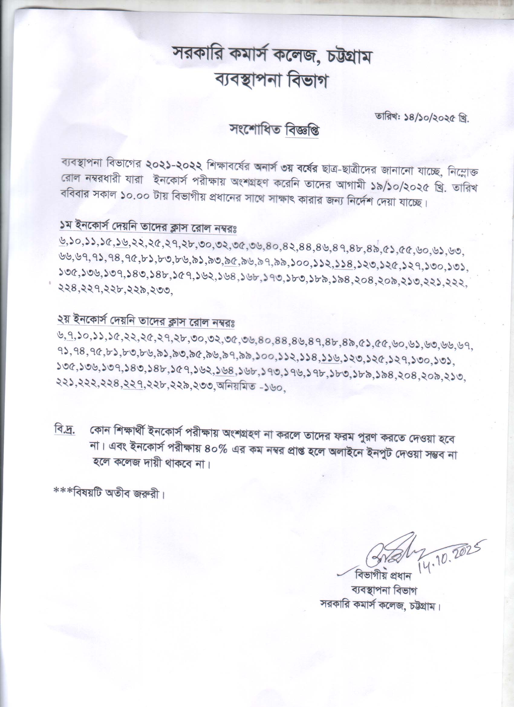 ব্যবস্থাপনা বিভাগের অনার্স ৩য় বর্ষের (2021-2022 শিক্ষাবর্ষ) শিক্ষার্থীদের ইনকোর্স পরীক্ষা সংক্রান্ত (সংশোধিত) বিজ্ঞপ্তি ।