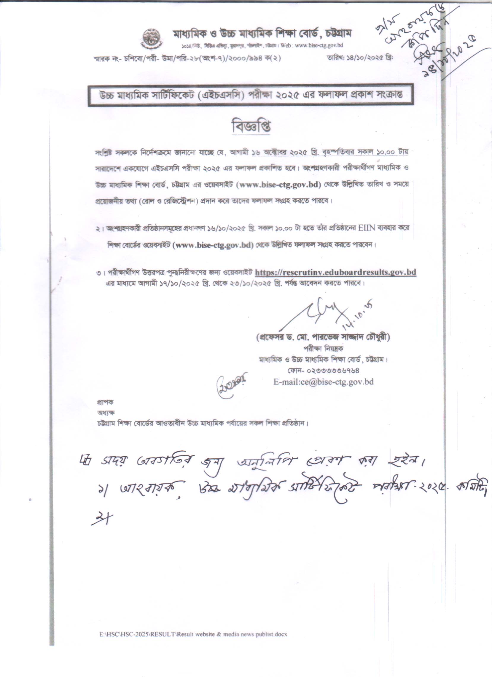 ২০২৫ সালের সালের উচ্চ মাধ্যমিক পরীক্ষার ফলাফল প্রকাশ সংক্রান্ত বিজ্ঞপ্তি ।